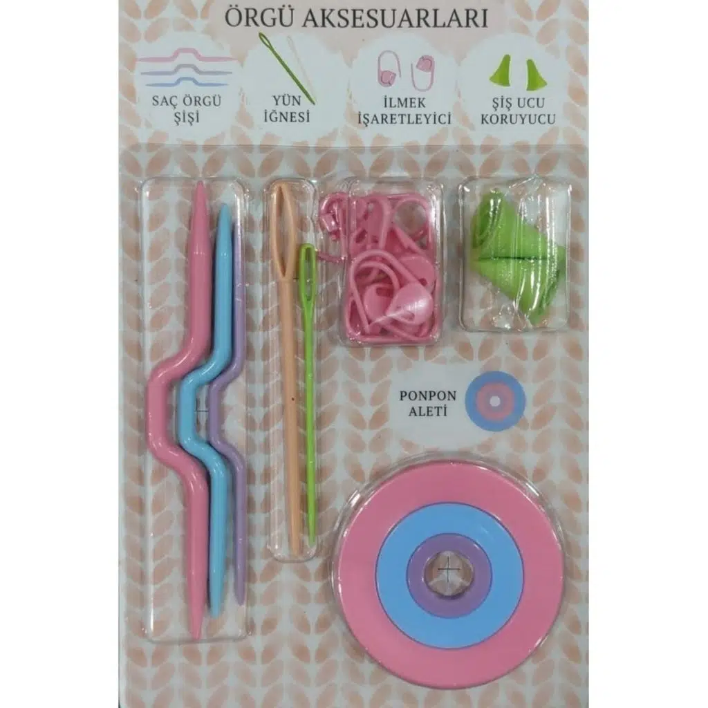 El örgüsünde örmeyi kolaylaştıran aparatlardan oluşan ideal bir settir. Set içerigi, Örgü yün iğnesi 2 adet ; , saç örgü iğnesi 3 boy ; şiş ucu koruyucu 2 adet ; Ponpon matik 2 boy ; Ilmek işaretleyici 10 adet ;