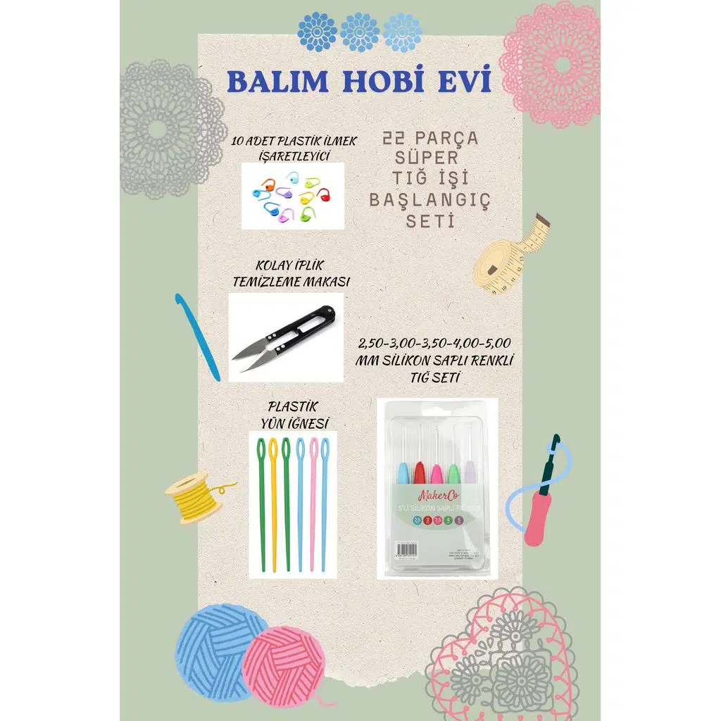 Tığ işine yeni başlayanlar ve pratik bir set arayanlar için özenle hazırlanmış Balım Hobi Evi 22 Parça Süper Tığ İşi Başlangıç Seti, ihtiyacınız olan temel malzemeleri tek pakette sunar.